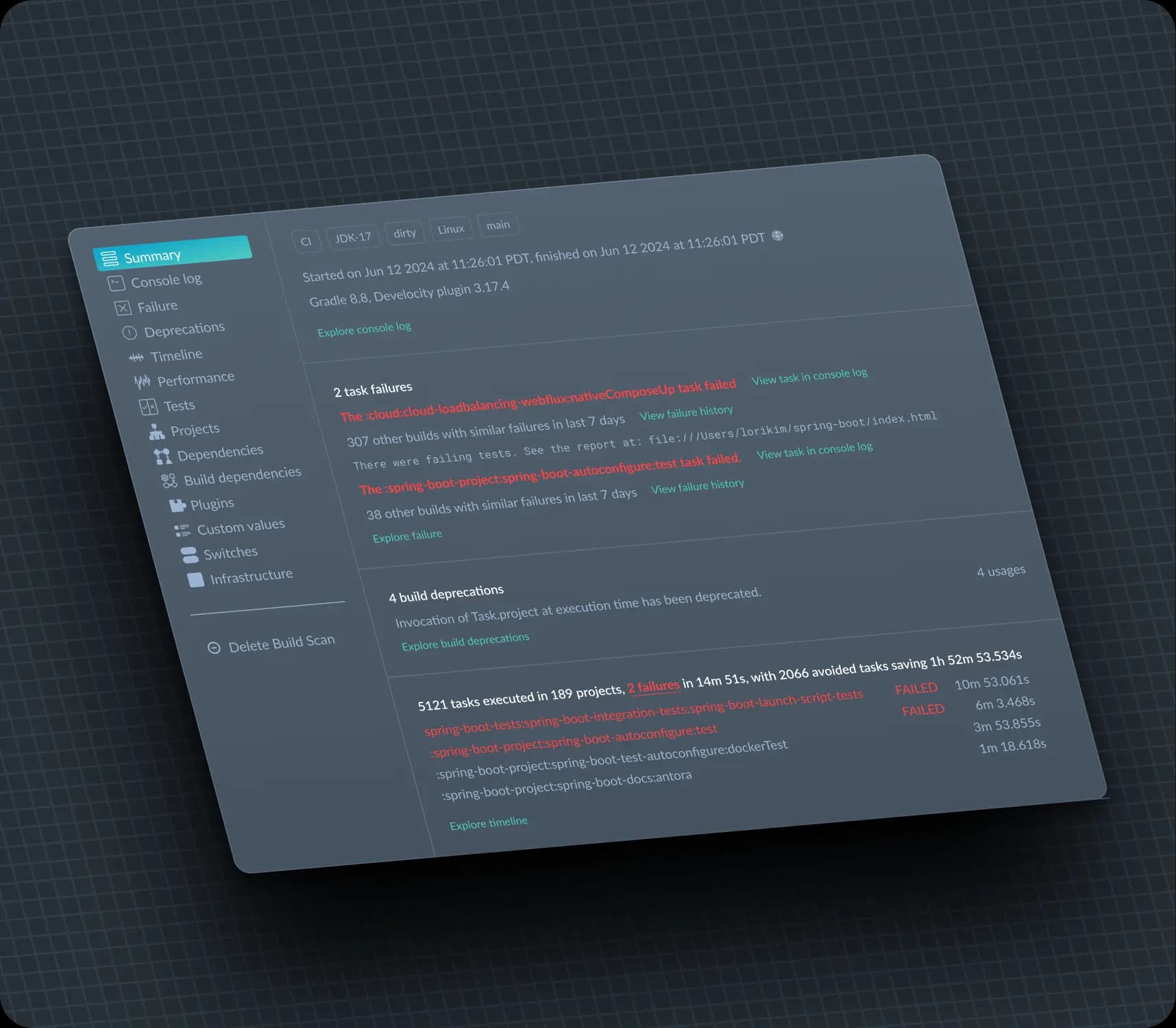 Build Scan gives developers detailed and comprehensive information for every build, enabling faster resolutions and more efficient collaboration.